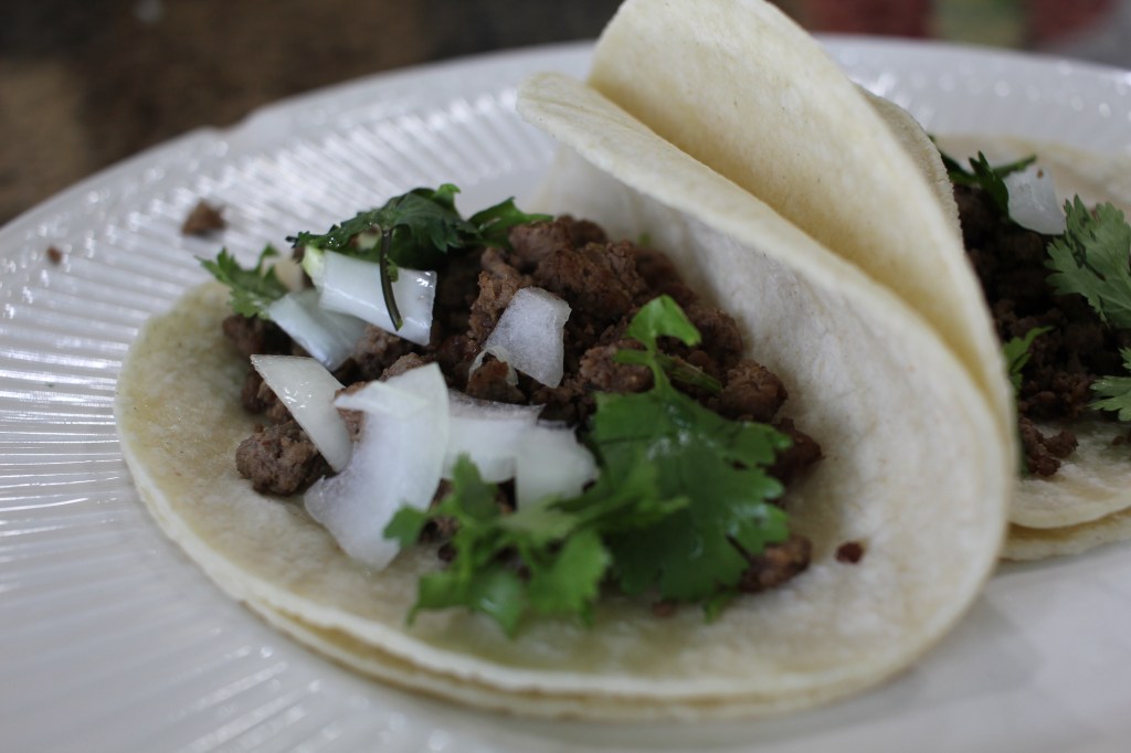 We love tacos. When cinco de mayo came, we didn’t have any tacos. We also didn’t have any meat except for hamburger. Dad told us to try making carne asada with the ground beef.