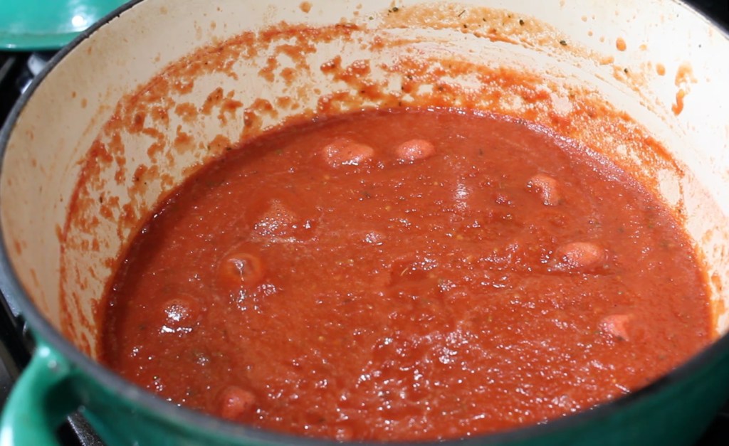 - Once the sauce is boiling, reduce heat and simmer for 30-60 minutes.